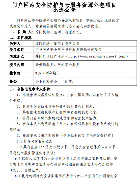 門戶網(wǎng)站安全防護(hù)與云服務(wù)資源外包項(xiàng)目比選公告