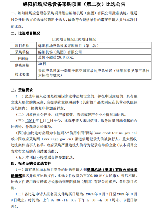 綿陽機(jī)場應(yīng)急設(shè)備采購項(xiàng)目(第二次)比選公告