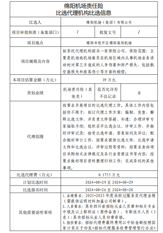 綿陽機場責任險 比選代理機構比選信息